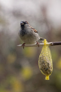 Then came a sparrow, and more specifically a house sparrow. If we are, this is the most common birds in Germany, but I've learned that is only in 5th place! And he is already quite large, so in comparison with the small tits: